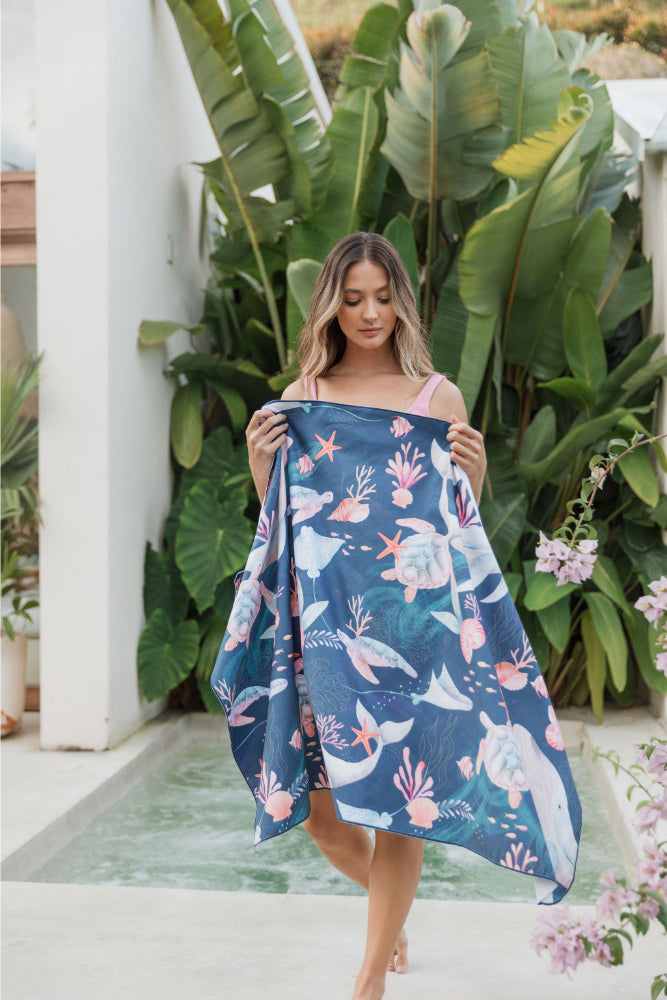 Toalla estampada de microfibra, incluye elástico para colgarla y facilitar su secado, vienen en empaque de tela para que la lleves a todas partes!